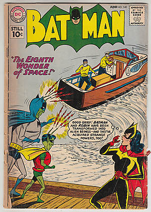 Moldoff cvr/art; Batwoman cvr; classic Joker ghost story, Superman app; COMIC BOOK IMPACT rating of 6 (CBI)Batman and Robin transform into aliens, gain powers.