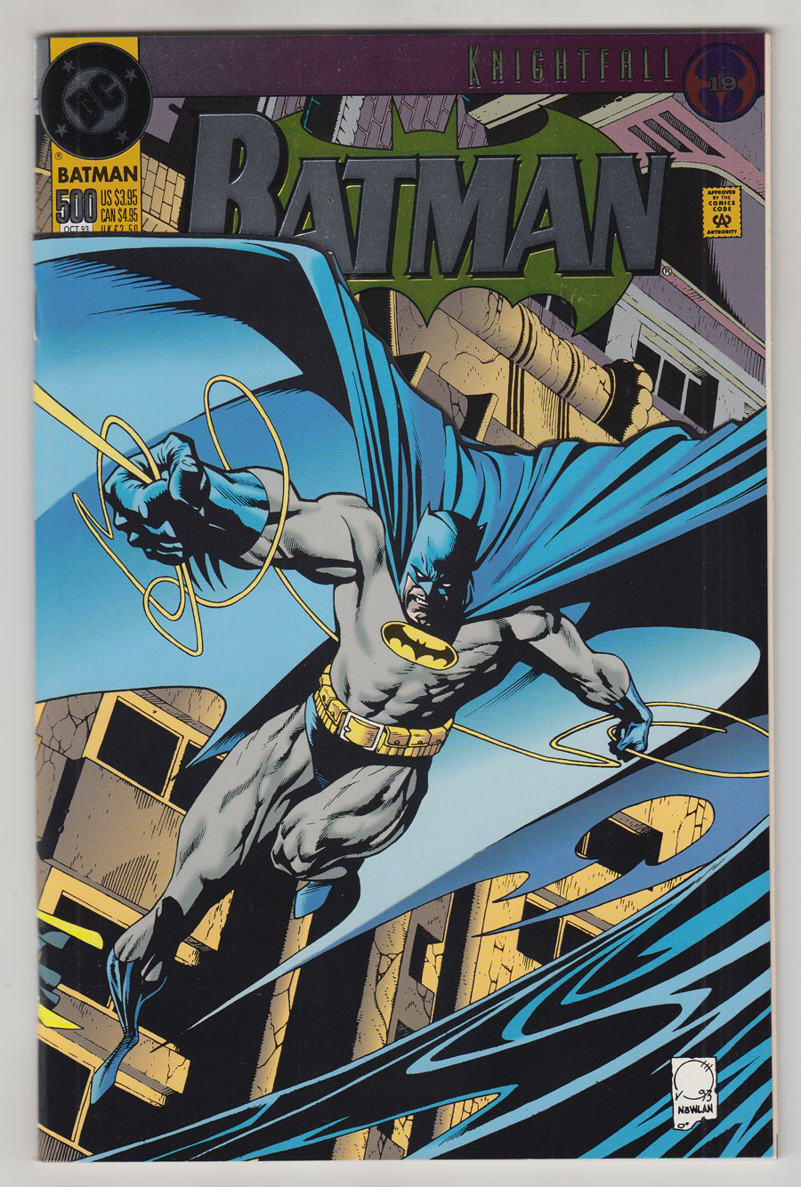Azrael as Batman (10/93) COMIC BOOK IMPACT rating of 6 (CBI)KnightFall Part 19. The concluding chapter of KnightFall finds Batman (Jean-Paul Valley) determined to break Bane the way the villain broke his predecessor in "Dark Angel." Nightwing cameo. Written by Doug Moench. Art for Chapter 1 ("The Fall") by Jim Aparo & Terry Austin. Art for Chapter 2 ("The Descent") by Mike Manley. Comes with 2 postcards: 'Classic Batman' by Jim Aparo and 'The New Batman' by Mike Manley. Wraparound die-cut cover by Joe Quesada & Kevin Nowlan.