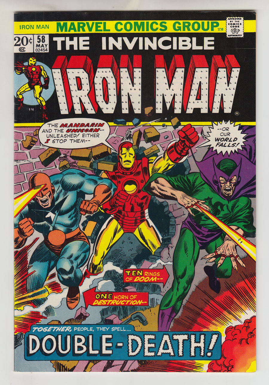 Double-Death (5/73)"Mandarin and the Unicorn: Double-Death!" Story by Steve Gerber and Mike Friedrich. Art by George Tuska, Frank Giacoia, and Mike Esposito. The Mandarin and the Unicorn join forces to fight Iron Man! Shell-head is defeated in round one as his chestplate is severely damaged. After realizing that his once weak heart has now healed, Tony repairs his armor and sets out to find the deadly duo. Will Shell-Head win round two? Meanwhile, Tony has hired Pepper Hogan as his personal secretary again.