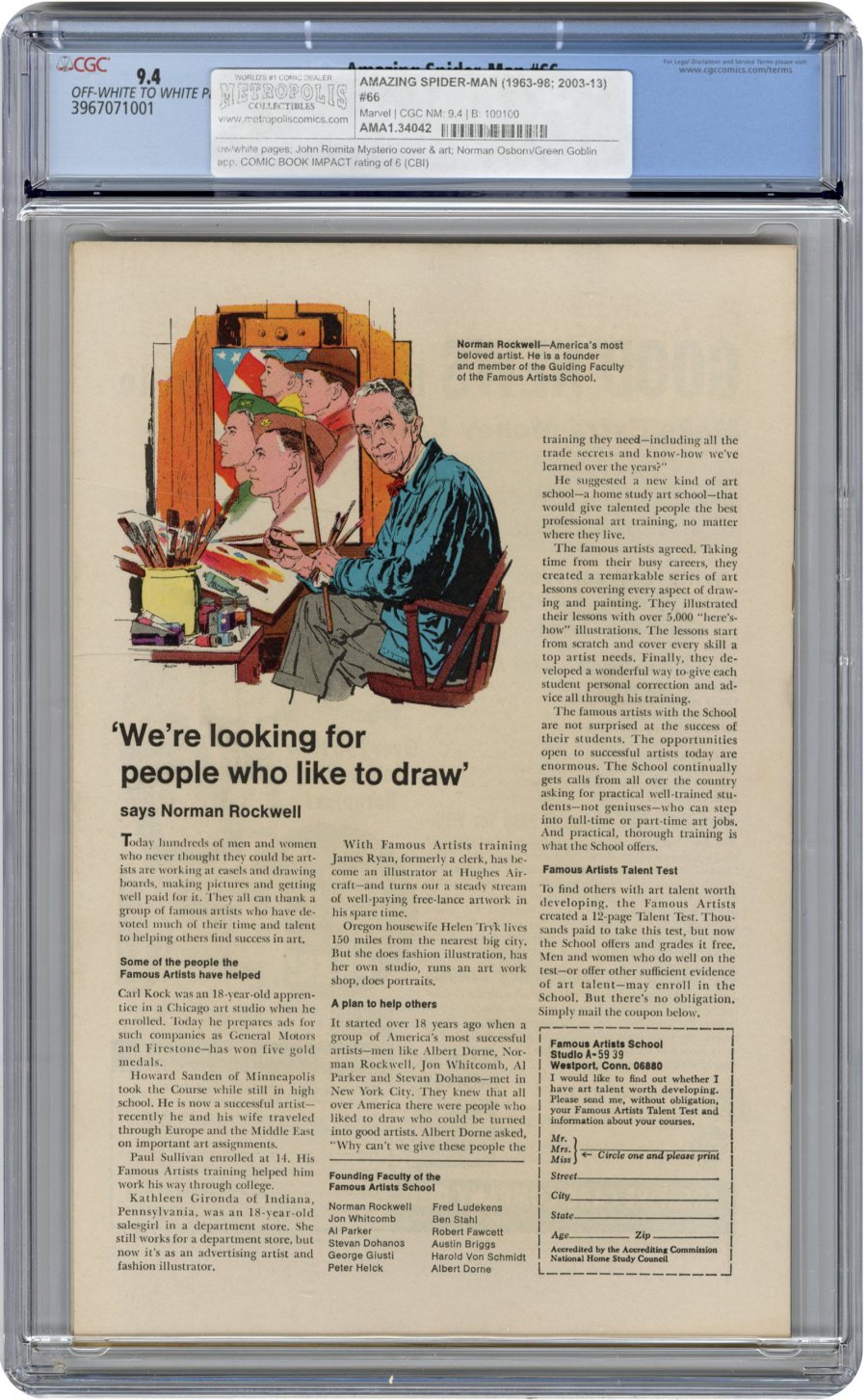John Romita Mysterio cover & art; Norman Osborn/Green Goblin app; COMIC BOOK IMPACT rating of 6 (CBI)Cover art by John Romita. "The Madness of Mysterio!" script by Stan Lee, pencils by John Romita (layouts) and Don Heck (pencils), inks by Mike Esposito (as Mick Demeo); Mysterio has broken out of prison and is using his special effects prowess to prepare another plot to get revenge against Spider-Man; Meanwhile, Spidey recovers his clothes and camera left in the debris following his fight with the Vulture; The next day he tries to sell the pictures to Jameson; Furious that Parker "abandoned" him when he was supposed to be taking pictures of Spider-Man's battle with the Vulture, he throws Parker out of the building, telling Peter that he doesn't need him to take pictures; Appearing on television, Mysterio issues a challenge to Spider-Man to meet him to a fight to the finish or he will start destroying city bridges. Guest appearance by the Green Goblin (a subplot continued in the Spectacular Spider-Man 2 magazine in 1968). Romita cover. Reprinted in Marvel Tales #49. Letter to the editor from comics writer Tony Isabella.