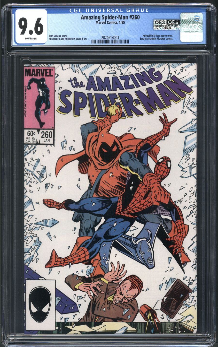 Hobgoblin app. (1/85) COMIC BOOK IMPACT rating of 6 (CBI)"The Challenge of Hobgoblin!" Script by Tom DeFalco. Pencils by Ron Frenz. Inks by Joe Rubinstein and Brett Breeding. Cover by Ron Frenz and Joe Rubinstein. The Hobgoblin and the Rose unleash their two-pronged attack on Harry Osborn! The goblin ambushes Harry at his corporate office, while the Rose's henchmen kidnap Liz Osborn and Mary Jane! Auspiciously, the wondrous wall-crawler is close by to lock horns with the Hobgoblin! But who is going to save MJ and Harry's expectant wife? Could it be the Green Goblin?!