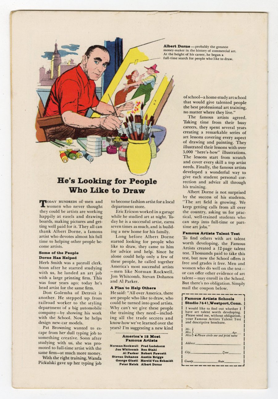 Nick Cardi (Nicholas Viscardi) was an American comics artist best known for his DC Comics work on Aquaman, the Teen Titans and other major characters. Cardy was inducted into the Will Eisner Comic Book Hall of Fame in 2005. Cardy entered the comics field working for the Eisner/Iger studio, joining circa 1940, he worked on Fight Comics, Jungle Comics, Kaanga Comics, and Wings for Fiction House Publications. He wrote and drew the four-page backup feature "Lady Luck" in Will Eisner's 16-page, Spirit Section, from the May 18, 1941 strip through February 22, 1942. In 1950, Cardy began his decades-long association with DC Comics, starting with the comic book Gang Busters, developing his breakout reputation with Tomahawk, his most prominent series at the time. From 1962–1968, he drew the first 39 issues of Aquaman, whose character had previously starred in a backup feature in Adventure Comics, and all its covers through the final issue (#56, April 1971). Cardy first drew the Teen Titans in The Brave and the Bold #60 (July 1965), wherein the superhero sidekicks Robin, Kid Flash, and Aqualad were joined by Wonder Woman's younger sister Wonder Girl in her first appearance. After next being featured in Showcase #59 (Dec. 1965), the team was spun off into their own series with Teen Titans #1 (Feb. 1966). From 1966–73, Cardy penciled or inked – sometimes both – all 43 issues of the series. Cardy left the comics industry in the mid-1970's for the more lucrative field of commercial art. There, under the name Nick Cardi, he did magazine art and ad illustrations, including movie advertising art (though not necessarily the "one-sheet" posters) for films including The Street Fighter (1974), The Night They Robbed Big Bertha's (1975), Neil Simon's California Suite (1978), Stanley Donen's Movie Movie (1978), Martin Ritt's Casey's Shadow (1978), and Francis Ford Coppola's Apocalypse Now (1979).