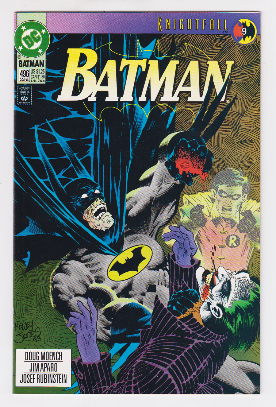Kelley Jones cover; Jim Aparo pencils; Joe Rubinstein inks; Joker/Scarecrow app; "Knightfall" part 9. COMIC BOOK IMPACT rating of 6 (CBI)