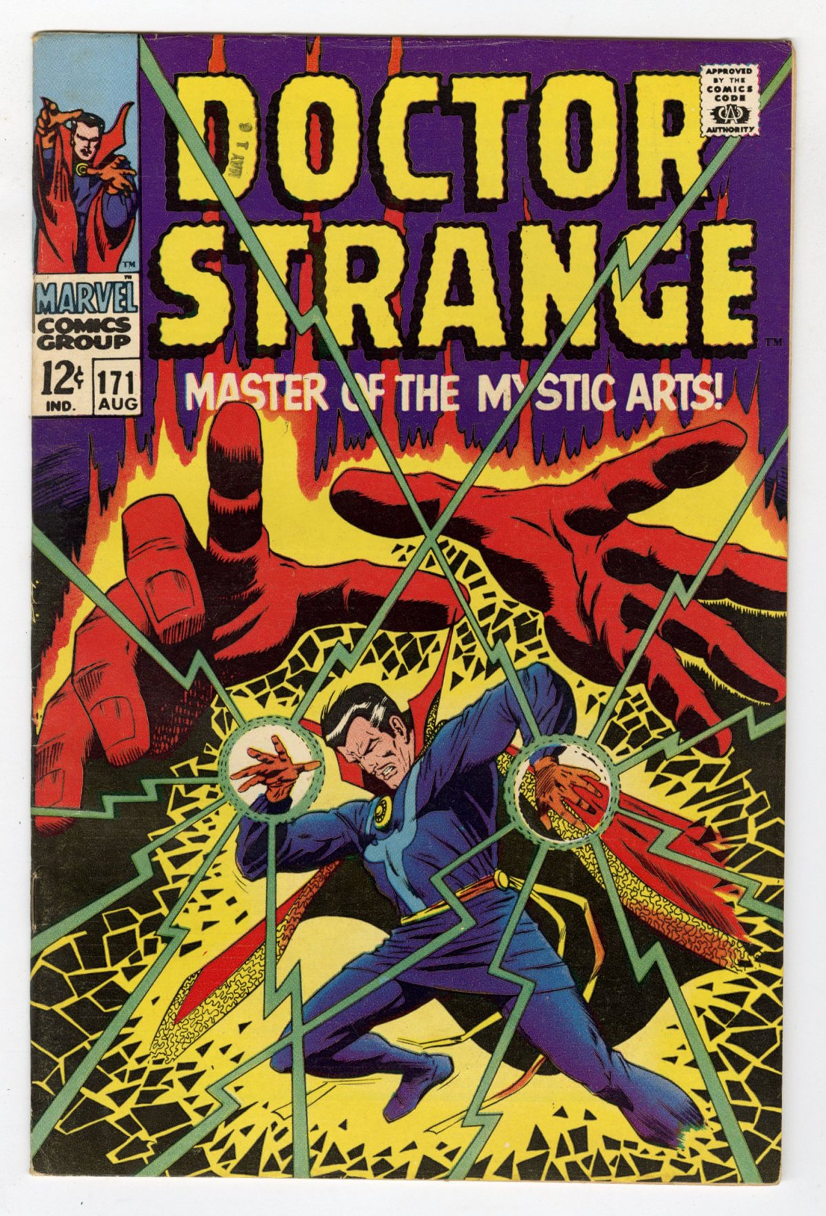 Cover art by Dan Adkins. In the Shadow of... Death!, script by Roy Thomas, pencils by Tom Palmer, inks by Dan Adkins; Strange, with Victoria Bentley as his mystic consort, seeks Clea in the Realm Unknown, only to confront Dormammu! Cover price $0.12.