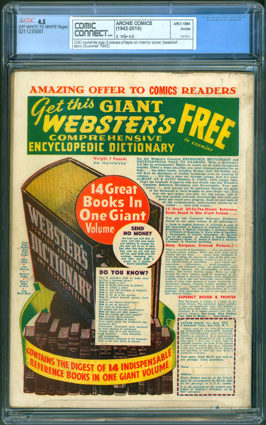 Harry Sahle cover/art; baseball story (Summer 1943) COMIC BOOK IMPACT rating of 6 (CBI)Finally! Archie #3 offers the first of his enduring love-triangle images, this is the quintessential Archie cover, Betty and Veronica, literally shooting Archie "daggers" with their eyes. Of course Jughead is of little help to the terribly aloof teenager, leaving our bow-tied ginger to sweat out the ultimate dilemma, whom to take to the prom? This is a boilerplate storyline that is still used regularly in Archie's long, long, stint in the world of comics.ÿý