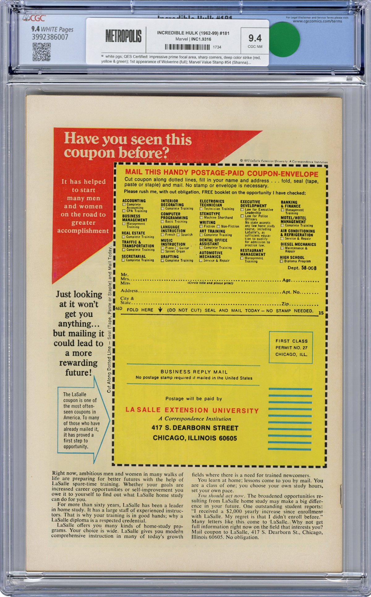 Incredible Hulk #181 became the first Bronze Age book to break the $100,000 sales mark.