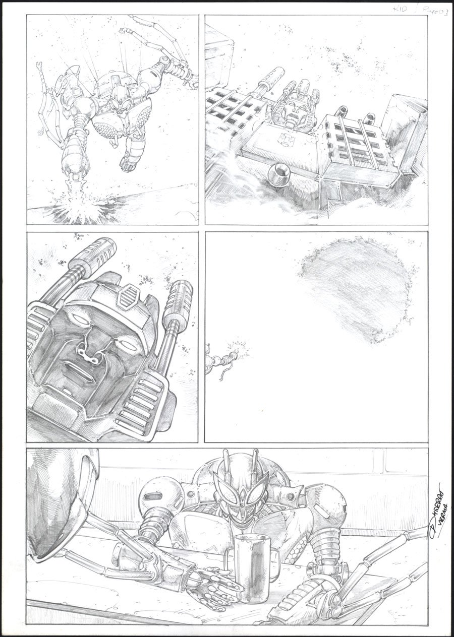 Dheeraj Verma art; pg. 3; 2013; image size 10.5" x 16"Beautiful, incredibly detailed penciled page from IDW's Transformers: Robots In Disguise showcasing Verma's mastery of technical drawing. This book, like most of Verma's comics, was printed from his tight and detailed pencils, and you can see why, the drawing on display is just exquisite. Verma is an artist of extraordinary talent who had a successful career in India before breaking into American comic books. He's also done work for Dynamite, Dark Horse, Avatar, Devil's Due and Marvel Comics. Art is in excellent condition. Signed by Verma.