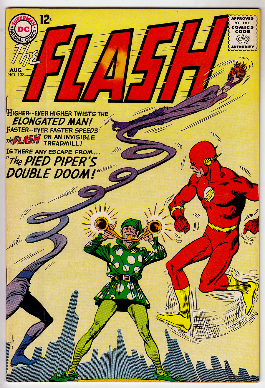 Carmine Infantino cover; Murphy Anderson/Joe Giella inks; Elongated Man,Pied Pipper app; COMIC BOOK IMPACT rating of 6 (CBI)Cover pencils by Carmine Infantino, inks by Murphy Anderson. The Pied Piper's Double Doom!, script by Gardner Fox, pencils by Carmine Infantino, inks by Joe Giella; The Pied Piper uses his musical control to force both The Flash and The Elongated Man to commit robberies and forget they did so, but the heroes meet while trying to solve each others' crimes and realize the Pied Piper is behind the scheme, and defeat him. How NOT To Enjoy A Vacation! public service announcement, script by Jack Schiff, art by Ruben Moreira. Letter from super fan Jerry Bails regarding the relative merits of the current Flash stories vs. the stories from the 1940's.