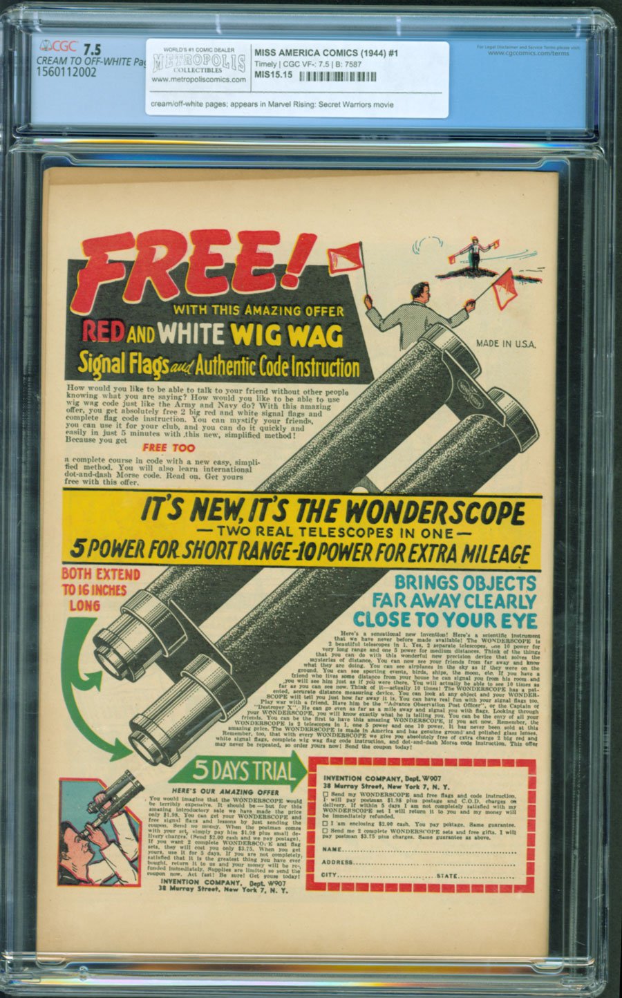 Ken Bald cvr/art; only issueAfter just two appearances in Marvel Mystery Comics, Miss America was awarded her own book. This issue was unique, as by Miss America #2 the title would switch to larger format and would change its focus to romance and articles concerning makeup, cooking, and other subjects meant to attract young female readers of the time. The cover features art by Ken Bald which shows Miss America in a heroic pose as she looms over some gangsters firing at her oversized figure. Miss America would go on the be rebooted as America Chavez in 2011 and appeared in an animated movie in 2018 titled "Marvel Rising: Secret Warriors."