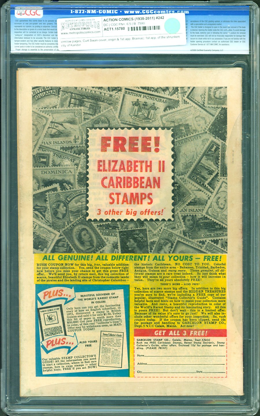 Curt Swan cover; origin & 1st app. Brainiac; 1st app. of the shrunken city of Kandor; COMIC BOOK IMPACT rating of 8 (CBI)Brainiac makes his first appearance in Action Comics #242 as a brilliant alien android with penchant for shrinking cities and storing them in bottles. That also explains why the shrunken Kryptonian city of Kandor make its own debut in this important chapter of Superman lore. Brainiac is now hotly rumored to finally make his big-screen debut in the upcoming Superman: Legacy—with the fannish anticipation helping to ensure that Brainiac's early appearances remain great investments!