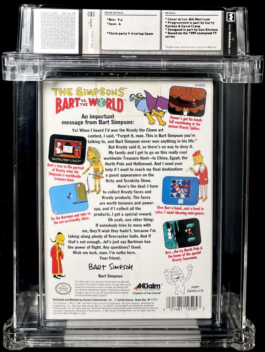 Cover Artist: Bill Morrison; Programmed in part by Garry Kitchens & David Crane; Designed in part by Dan Kitchen; Based on the 1989 animated TV series.An important message from Bart Simpson: Yo! When i heard I'd won the Krusty the Clown art contest, I said, "Forget it, man. This is Bart Simpson you're talking to, and Bart Simpson never won anything in his life." But Krusty said it, so there's no way to deny it. My family and I get to go on this really cool worldwide Treasure Hunt - to China, Egypt, the North Pole and Hollywood. And I need your hep if I want to reach my final destination: a guest appearance on the Itchy and Scratchy Show. Here's the deal: I have to collect Krusty faces and Krusty products. The faces are worth bonuses and power-ups, and if I collect all the products, I get a special reward. Oh yeah, one other thing: If somebody tries to mess with me, they'll wish they hadn't, because I'm taking along plenty of firecracker balls. And if that's not enough...let's just say Bartman has the power of flight. Any questions? Good. Wish me luck, man. I'm outta here. Your friend, Bart Simpson.
