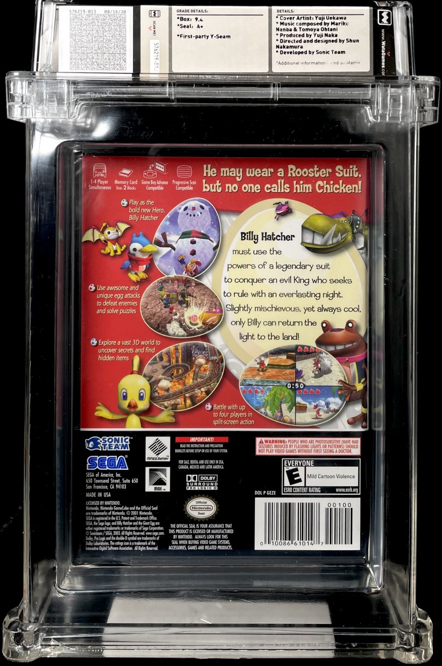 Cover artist: Yuji Uekawa; Music composed by Mariko Nanba & Tomoya Ohtani; Produced by Yuji Naka; Directed and designed by Shun Nakamura; Developed by Sonic Team.He may wear a Rooster Suit, but no one calls him Chicken! Billy Hatcher must use the powers of a legendary suit to conquer an evil King who seeks to rule with everlasting night. Slightly mischievous, yet always cool, only Billy can return the light to the land.