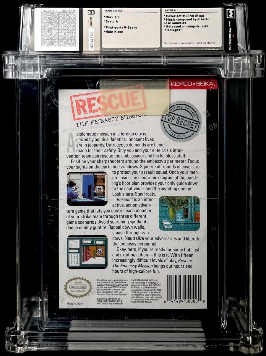 Cover Artist: Erik Olson; Music composed by Alberto Jose Gonzalez; Released on computer as "Hostages".A diplomatic mission in a foreign city is seized by political fanatics. Innocent lives are in jeopardy. Outrageous demands are being made for their safety. Only you and your elite crisis intervention team can rescue the ambassador and his helpless staff. Position your sharpshooters around the embassy's perimeter. Focus your sights on the curtained windows. Squeeze off rounds of cover fire to protect your assault squad. Once your men are inside, an electronic diagram of the building's floor plan provides your only guide down to the captives - and the awaiting enemy. Look sharp. Stay frosty. Rescue is an interactive, action adventure game that lets you control each member of your strike team through three different game scenarios. Avoid searching through windows. Neutralize your adversaries and liberate the embassy personnel. Okay, hero, if you're ready for some hot, fast and exciting action - this is it. With fifteen increasingly difficult levels of play, Rescue: The Embassy Mission bangs out hours and hours of high-calibre fun.