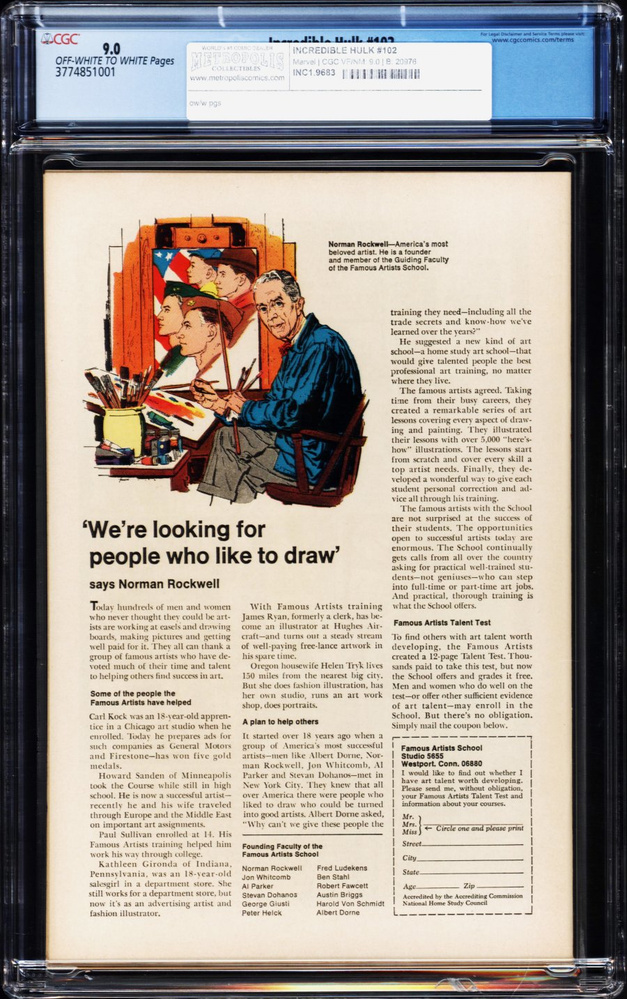 Marie Severin cover/art; 1st issue (cont from Tales to Astonish #101); origin retold; Odin app; COMIC BOOK IMPACT rating of 7 (CBI)Bruce Banner is falling down a bottomless pit back to Midgard when the Enchantress plucks him back to Asgard out of curiosity; The Warriors Three consult Oldar the Oracle and find out the origins of the Hulk; Captured by Enchantress and Executioner, Banner transforms into the Hulk which enrages the Executioner who has fought the jade giant before (back in TTA #77); Leaving the Hulk behind, the evil duo lead an army of trolls against Asgard and the Hulk arrives on the scene just in time to lend a hand in the victory of Odin's forces. House ad for Not Brand Echh #7 and Daredevil #38.