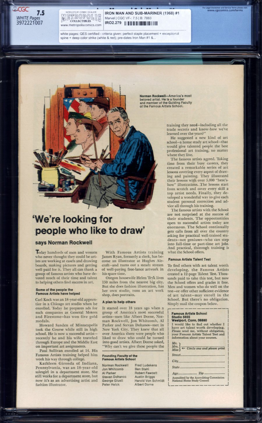 classic Bill Everett cover, pre-dates Iron Man #1 and Sub-Mariner #1; COMIC BOOK IMPACT rating of 7 (CBI)The cover boasts an action packed team-up between the titular heroes that never happens—so, you know, "don't judge a book by its cover." Instead this comic contains two separate stories continuing from Tales of Suspense and Tales to Astonish respectively; predating both Iron Man #1 and Sub-Mariner #1. With Iron Man's popularity peaking on the silver screen and Sub-Mariner's soon to come, this will undoubtedly be a highly sought-after issue for collectors and aficionados.