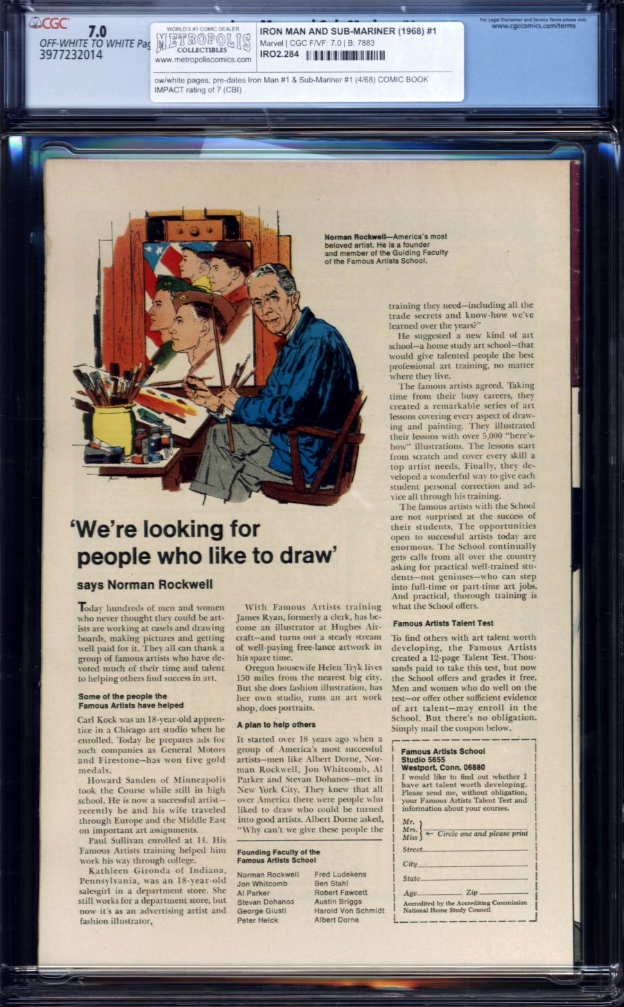classic Bill Everett cover, pre-dates Iron Man #1 and Sub-Mariner #1; COMIC BOOK IMPACT rating of 7 (CBI)The cover boasts an action packed team-up between the titular heroes that never happens—so, you know, "don't judge a book by its cover." Instead this comic contains two separate stories continuing from Tales of Suspense and Tales to Astonish respectively; predating both Iron Man #1 and Sub-Mariner #1. With Iron Man's popularity peaking on the silver screen and Sub-Mariner's soon to come, this will undoubtedly be a highly sought-after issue for collectors and aficionados.