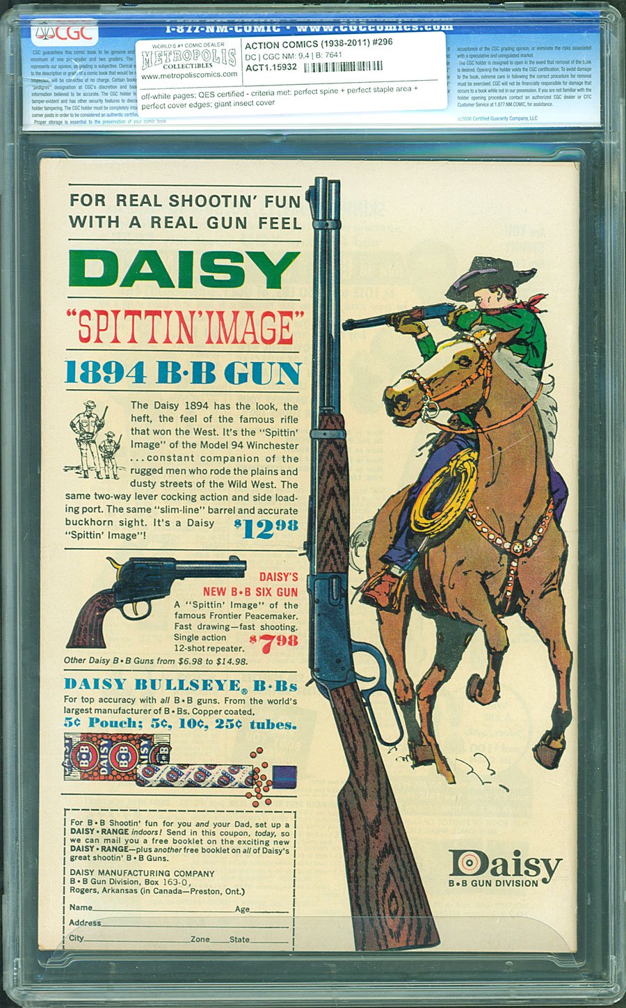 giant insect coverCover pencils by Curt Swan, inks by George Klein. "The Invasion of the Super-Ants!", art by Al Plastino; When giant ants invade Metropolis, Superman uses Red Kryptonite to alter his head to resemble an ant's, so that he can communicate with the ants, who have kidnapped Lois Lane. One-page Cora the Car Hop story by Henry Boltinoff. Supermen of America ad. Superman ad. Batman and Robin ad. "The Girl Who Was Supergirl's Double!", script by Leo Dorfman, art by Jim Mooney; A series of coincidental events lead Dick to believe that Lena is really Supergirl, and he begins to pay her extra attention, which makes Linda jealous.