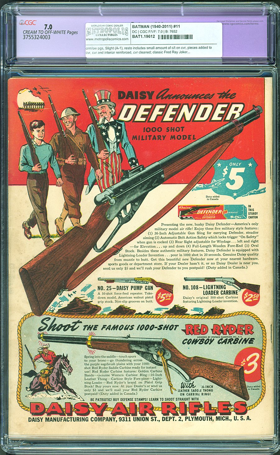 Batman #11 sports yet another classic cover from beloved Batman artist Fred Ray, with a legendary story inside to back up the hard-hitting action. Actually, things look kind of playful as King Batman socks the Joker right out of his own themed card. There's a more serious beating in store for the Joker in "The Joker's Advertising Campaign," though. This classic story begins frivolously enough with the Clown Prince of Crime basing his heists around clues found in newspaper ads. Then we get the first actual death of Robin, when the Boy Wonder pursues the Joker and ends up locked in a room full of burning sulfur. Batman and the Gotham City PD actually arrive too late to save Robin, with the cops assuring Batman, "This boy's dead!"