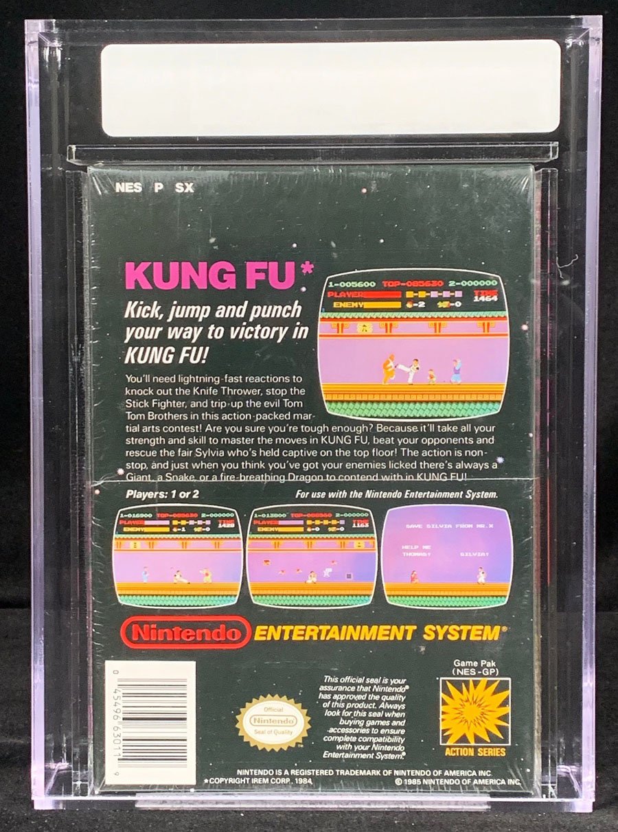 NES Launch Title; Port of the 1984 Data East arcade game "Kung-Fu Master".Kick, jump and punch your way to victory in KUNG FU! You'll need lightning fast reactions to knock out the Knife Thrower., stop the Stick Fighter, and trip up the evil Tom Tom Brothers in this action packed martial arts contest! Are you sure you're tough enough? Because it'll take all your strength and skill to master the moves in KUNG FU, beat your opponents and rescue the fair Sylvia who's held captive on the top floor! The action is non stop and just when you think you've got your enemies licked there's always a Giant, a Snake, or a fire breathing Dragon to contend with in KUNG FU!