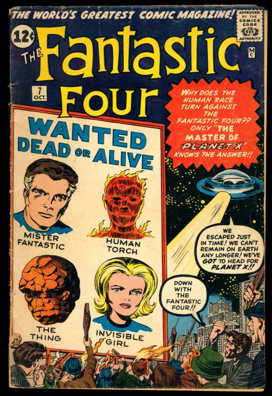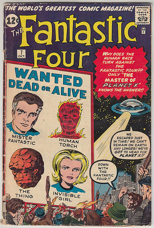 Jack Kirby cover/art; COMIC BOOK IMPACT rating of 6 (CBI)In Fantastic Four #7, the seeds that would eventually grow into the inspiration for the X-Men are sown by Kirby and Lee as they weave a tale that highlights the sense of otherness and fear of alienation that the new wave of Marvel superheroes were acutely aware of, as is evinced by the FF's reluctance to attend a dinner in their honor in Washington D.C. Their trepidation is soon validated as their hosts turn on them and they beat a hasty retreat back to the safety of the Baxter building, only to discover they have been unknowingly drafted into preventing a cosmic calamity by the shifty Kurrgo, Master of Planet X. The rest of the story is a real nail-biter of mega, and miniature, proportions all at once.