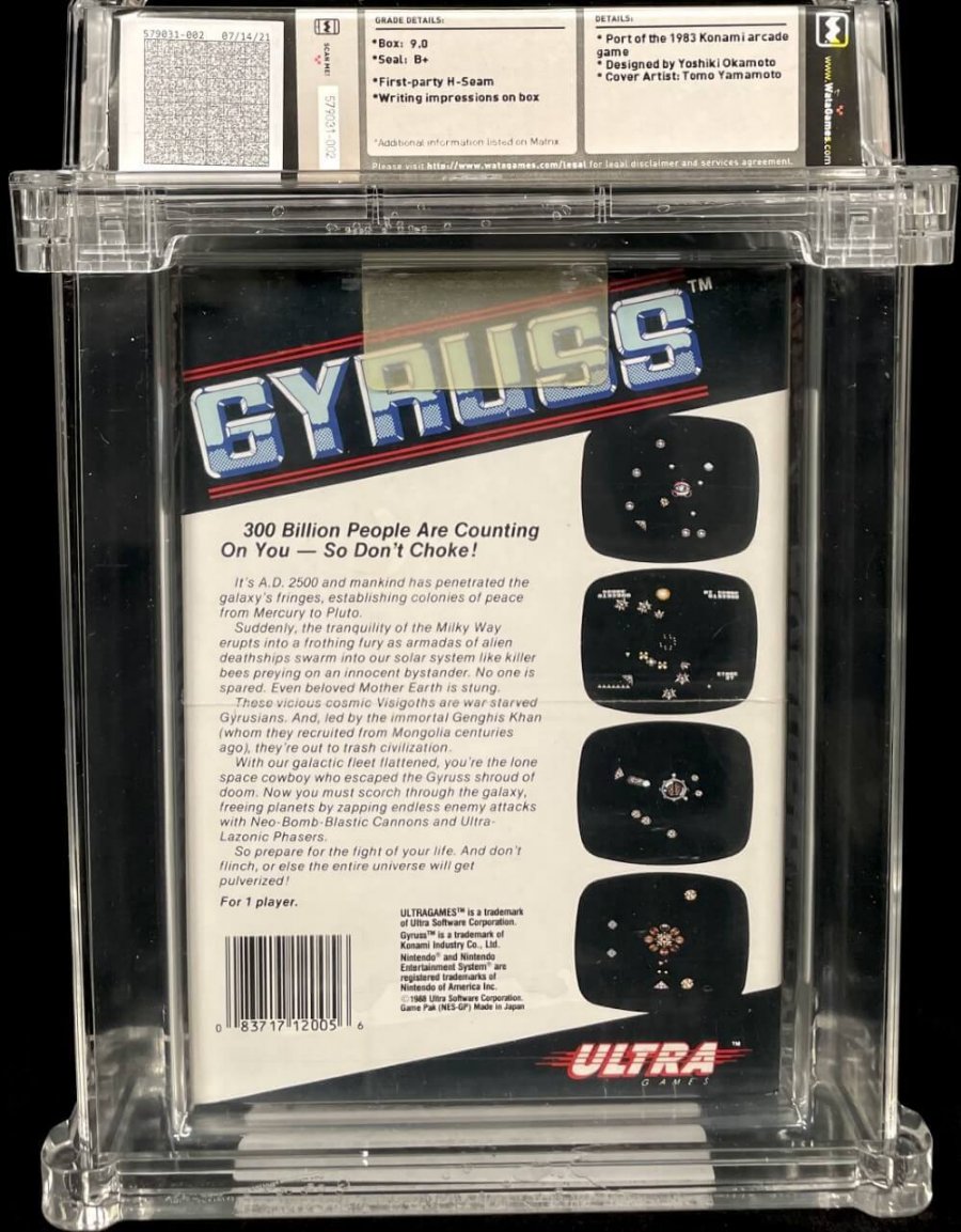 It's A.D. 2500 and mankind has penetrated the galaxy's fringes, establishing colonies of peace from Mercury to Pluto. Suddenly, the tranquility of the Milky Way erupts into frothing fury as armadas of alien deathships swam into our solar system like killer bees preying on a innocent bystander, No one is spared. Even beloved Mother Earth is stung. These vicious cosmic Visigoths are war starved Gyrusians. And, led bu the immortal Genghis Khan(whom they recruited from Mongolia centuries ago), they're out to trash civilization. With our galactic fleet flattened, you're the lone space cowboy who escapes the Gyruss shroud of doom. Now you must scorch through the galaxy, with Neo-Bomb-Blaster Cannons and Ultra-Lazonic Phasers. So prepare for the fight of your life. And don't flinch, or else the entire universe will get pulverized!