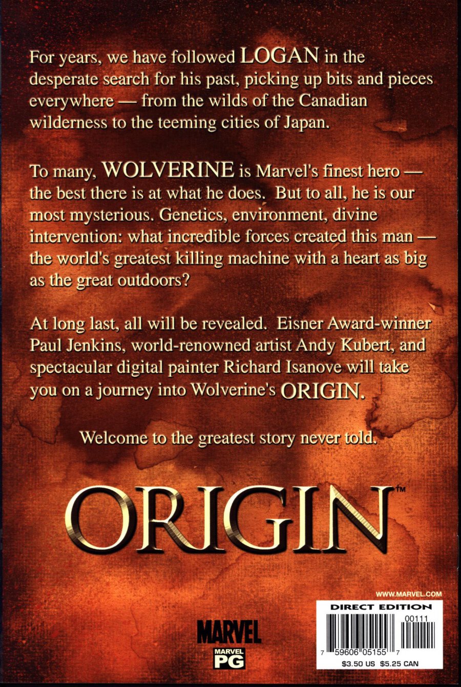 Quesada cover; Andy Kubert artAlmost thirty years after his first appearance, Wolverine - the most enigmatic and popular character in comics - will finally have the story of his origin told for the first time! Who is the mysterious man known only as Logan? Where does he come from? How did his powers first appear? This special six-issue series will finally answer the question: who is the man known as Wolverine?! Throw away your expectations and prepare to enter the unknown!