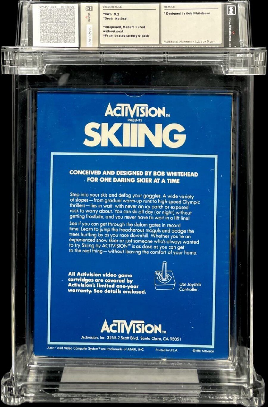 Designed by Bob WhiteheadFOR ONE DARING SKIER AT A TIME! Step into your skis and defog your goggles. A wide variety of slopes- from gradual warm-up runs to high-speed Olympic thrillers - lie in wait, with never an icy patch or exposed rock to worry about. You can ski all day (or night) without getting frostbite, and you never have to wait in a lift line! See if you can get through the slalom gates in record time. Learn to jump the treacherous moguls and dodge the trees hurtling by as you race downhill. Whether you're an experienced snow skier of just someone who's always wanted to try, Skiing by ACTIVISION is as close as you can get to the real thing - without leaving the comfort of your home.
