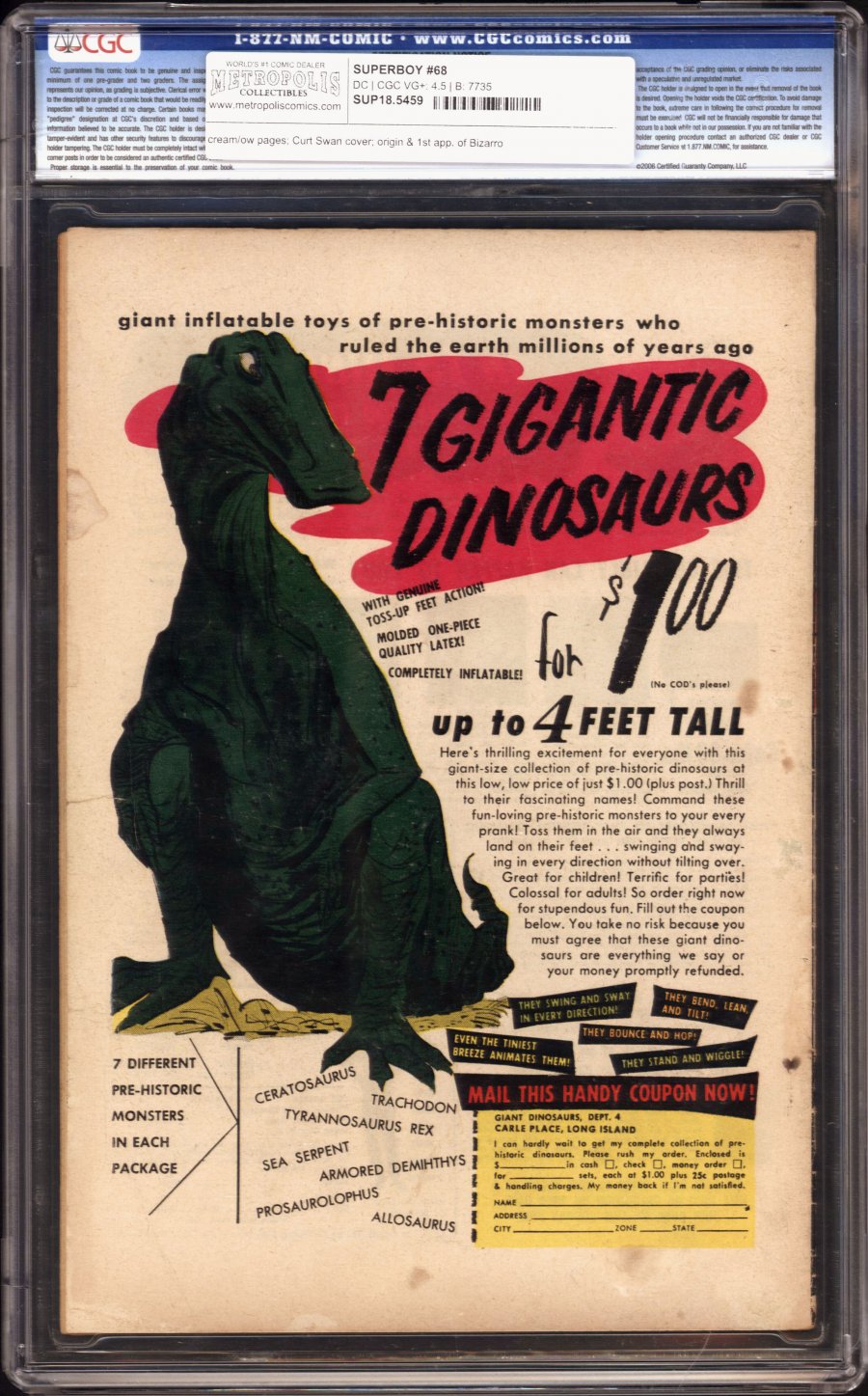 origin & 1st app of Bizarro; Curt Swan cover; COMIC BOOK IMPACT rating of 8 (CBI)Created by the team of Otto Binder and George Papp, the hapless Bizarro made his first appearance in this very issue. He was brought to life by a malfunctioning duplicating ray fired at Superboy; Bizarro was born, with all the powers of the Kryptonian, but not much of his brains. The character would strike a chord with DC Superfans and go on to become a regular nemesis, and occasional companion, to the Man of Steel. Silver Age DC keys are difficult to come by, especially in higher grades, and this book is no exception, a serious must have comic for anyone with a soft spot for the amusing antics of the beloved backwards Bizarro.