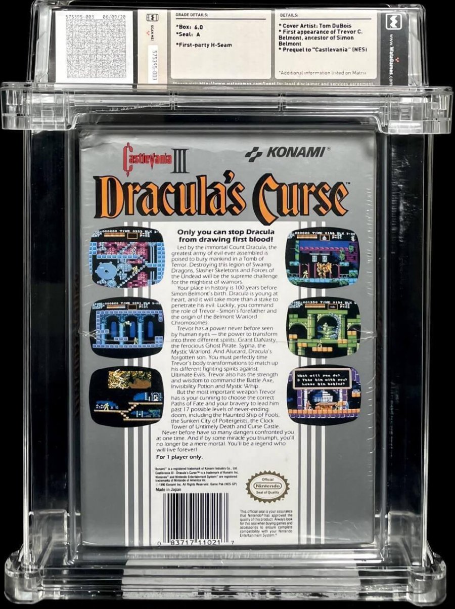 Cover Artist: Tom DuBois; First appearance of Trevor C. Bellmont, ancestor of Simon Belmont; Prequel to :Castlevania" (NES).Only you can stop Dracula from drawing first blood! Led by the immortal Count Dracula, the greatest army of evil ever assembled is poised to bury mankind in a Tomb of Terror. Destroying this legion of Swamp Dragons, Slashers Skeletons and Forces of the Undead will be the supreme challenge for the mightiest of warriors. Your place in history is 100 years before Simon Belmont's birth. Dracula is young at heart, and it will take more than a stake to penetrate his evil. Luckily, you command the role of Trevor - Simon's forefather and the origin of the Belmont Warlord Chromosomes. Trevor has a power never before seen by human eyes - the power to transform into three different spirits: Grant DaNasty, the ferocious Ghost Pirate; Sypha, the Mystic Warlord, and Alucard, Dracula's forgotten son. You must perfectly time Trevor's body transformations to match up his different fighting spirits against ultimate evils. Trevor also has the strength and wisdom to command the Battle Axe, Invisibility Potion and Mystic Whip. But the most important weapon Trevor has is your cunning to choose the correct Paths of Fate and your bravery to lead him past 17 possible levels of never-ending doom, including the Hunted Ship of Fools, Tower of Untimely Death and Curse Castle. Never before have so many dangers confronted you at one time. And if by some miracle you triumph, you'll no longer be a mere mortal. You'll be a legend who will live forever,