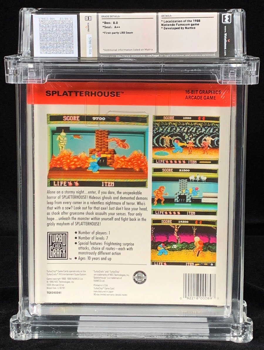 Localization of the 1988 Nintendo Famicom game; Developed by NamcoAlone on a stormy night...enter, if you dare, the unspeakable horror of SPLATTERHOUSE! Hideous ghouls and demented demons leap from every corner in a relentless nightmare of terror. Who's that with a saw? Look out fort that axe! Just don't lose your head, as shock after gruesome shock assaults your senses. Your only hope...unleash the monster within yourself and fight back in the grisly mayhem of SPLATTERHOUSE!