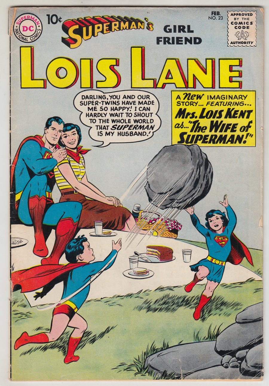 1st Lois as Elastic Lass; COMIC BOOK IMPACT rating of 5 (CBI)Cover pencils by Curt Swan, inks by Stan Kaye. The 10 Feats of Elastic Lass!, script by Otto Binder, art by Kurt Schaffenberger; Lois borrows Jimmy Olsen's serum and becomes Elastic Lass so she can catch the Wrecker, who has been blowing up statues around Metropolis. house ad for Superman Annual #2. The Curse of Lena Thorul!, script by Jerry Siegel, art by Kurt Schaffenberger; Strange events lead Lois to believe that librarian Lena Thorul is the reincarnation of a witch put to death in the seventeenth century. The Wife of Superman!, script by Jerry Siegel, art by Kurt Schaffenberger; Lois is jealous because Lana has taken her old job and also flirts constantly with Superman.