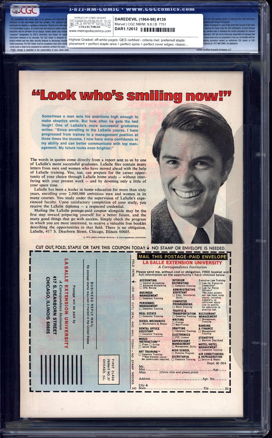 off-white pages; QES certified - criteria met: preferred staple placement + perfect staple area + perfect spine + perfect cover edges