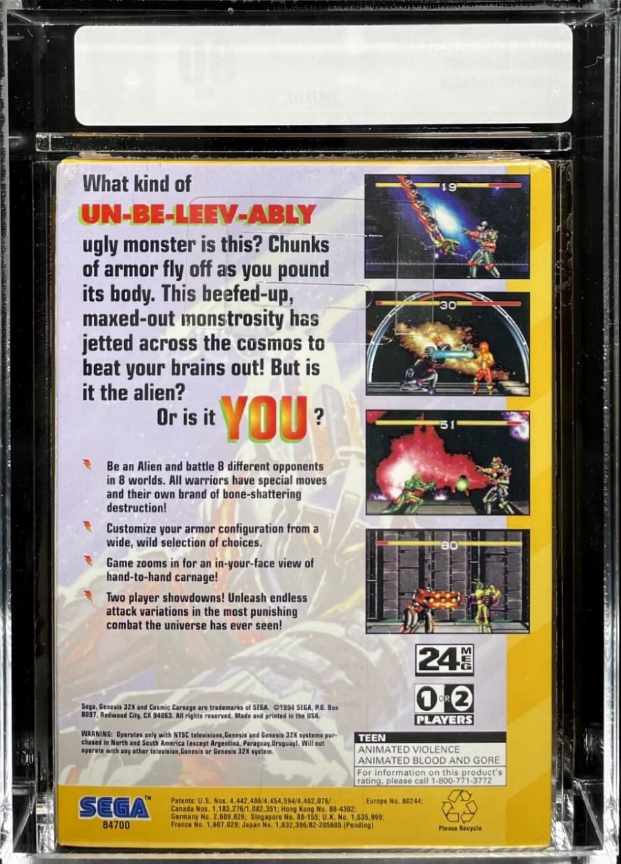 Sega 32X launch title; Released in Japan as "Cyber Brawl"; Developed by Almanac CorporationWhat kind of UN-BE-LEEV-ABLY ugly monster is this? Chunks of armor fly off as you pound its body. This beefed-up, maxed-out monstrosity has jetted across the cosmos to beat your brains out! But is it the alien? Or is it you?