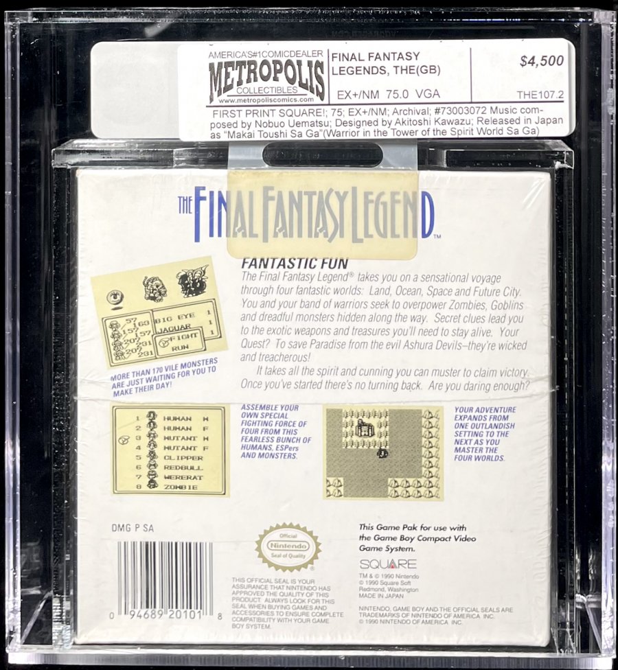 Music composed by Nobuo Uematsu; Designed by Akitoshi Kawazu; Released in Japan as "Makai Toushi Sa Ga"(Warrior in the Tower of the Spirit World Sa Ga)FANTASTIC FUN! The Final Fantasy Legend takes you on a sensational voyage through four fantastic worlds: Land, Ocean, Space and Future City. You and your band of warriors seek to overpower Zombies, Goblins and dreadful monsters hidden along the way. Secret clues lead you to the exotic weapons and treasures you'll need to stay alive. Your Quest? To save paradise from the evil Ashura Devils - they're wicked and treacherous! It takes all the spirit and cunning you can muster to claim victory. Once you've started there's no turning back. Are you daring enough?
