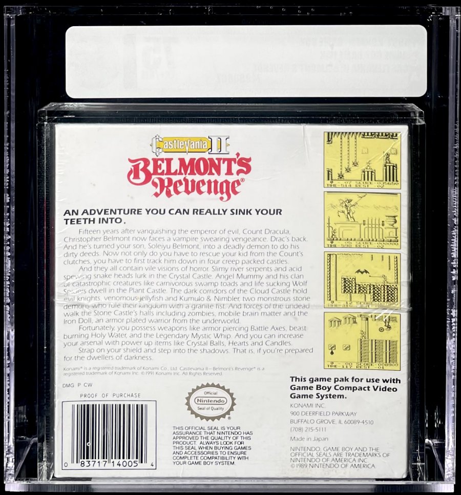 75; EX+/NM; Archival; First-party H-SeamAN ADVENTURE YOU CAN REALLY SINK YOUR TEETH INTO. Fifteen years after vanquishing the emperor of evil, Count Dracula, Christopher Belmont now faces a vampire swearing vengeance. Drac's back. And he's turned your son, Soleiyu Belmont, into a deadly demon to do his dirty deeds. Now not only do you have to rescue your kid from the Count's clutches, you have to first track him down in four creep packed castles. And they all contain vile versions of horror. Slimy river serpents and acid spewing snake heads luck in the Crystal Castle. Angel Mummy and his clan of catastrophic creatures like carnivorous swamp toads and life sucking Wolf Spiders dwell in the Plant Castle. The dark corridors of the Cloud Castle hold evil knights, venomous jellyfish and Kumulo & Nimbler, two monstrous stone demons who rule their kingdom with a granite fist. And forces of the undead walk the Stone Castle's halls including zombies, mobile brain matter and the Iron Doll, an armor plated warrior frim the underworld. Fortunately, you possess weapons like armor piercing Battle Axes, beast burning Holy Water, and the Legendary Mystic Whip. And you can increase your arsenal with power up items like Crystal Balls, Hearts and Candles. Strap on your shield and step into the shadows. That is, if you're prepared for the dwellers of darkness.