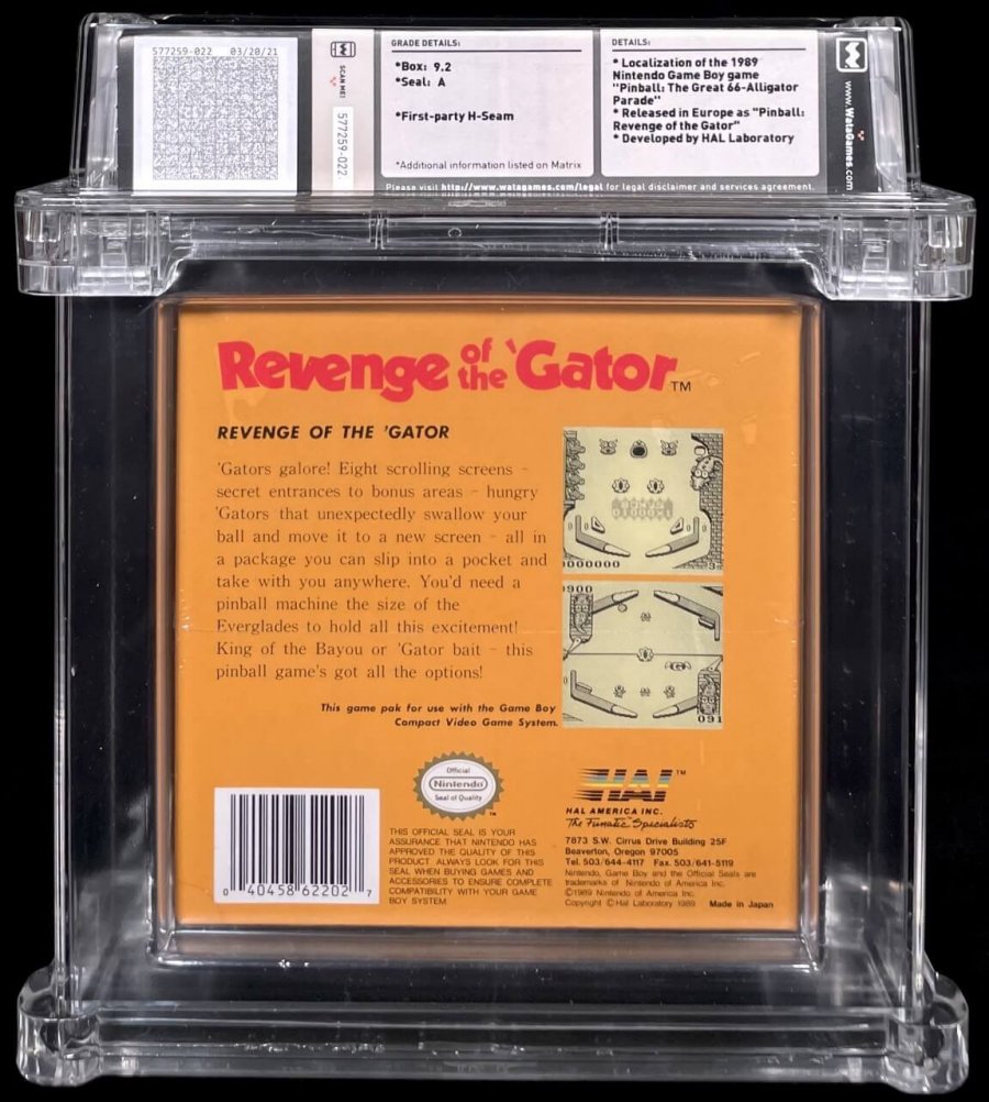 Localization of the 1989 Nintendo Game Boy game "Pinball: The Great 66-Aligator Parade"; Released in Europe as "Pinball: Revenge of the Gator"; Developed by HAL LaboratoryREVENGE OF THE 'GATOR! "Gators galore! Eight scrolling screens - secret entrances to bonus areas - hungry 'Gators that unexpectedly swallow your ball and move it to a new screen - all in a package you can slip into a pocket and take with you anywhere. You'd need a pinball machine the size of the Everglades to hold all this excitement! King of the Bayou or 'Gator bait - this pinball game's got all the options.