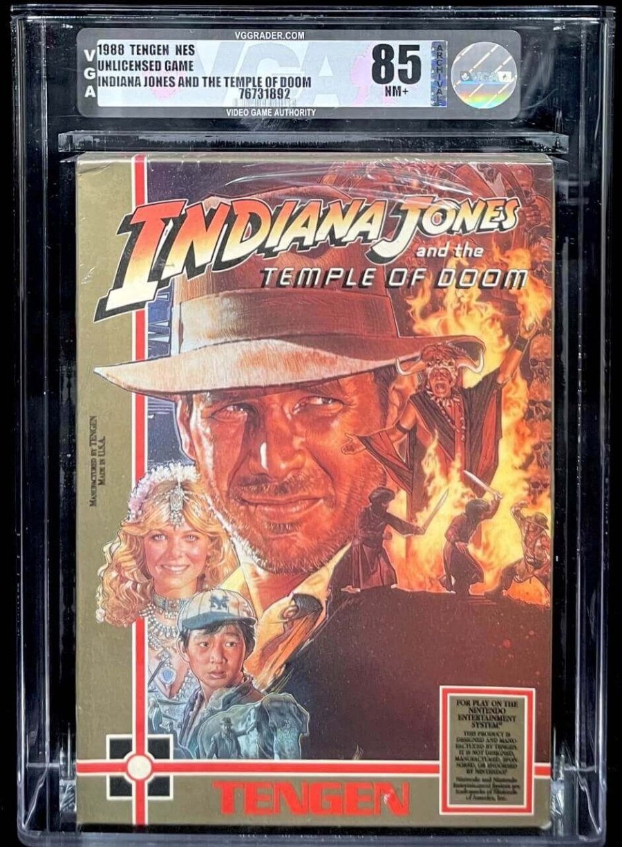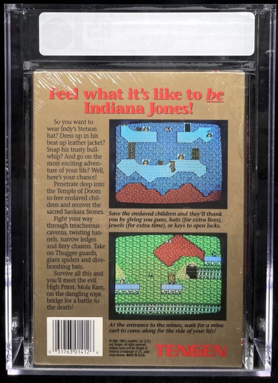 85; Archival; NM+; #76731892; Unlicensed game;So you want to wear Indy's Stetson hat? Dress up in his beat up leather jacket? Snap his trusty bullwhip? And go on the most exciting adventure of your life? Well, here's your chance! Penetrate deep into the Temple of Doom to free enslaved children and recover the sacred Sankara Stones. Fight your way through treacherous caverns, twisting tunnels, narrow ledges and fiery chasms. Take on Thuggee guards, giant spiders and divebombing bats. Survive all this and you'll meet the evil High Priest Mola Ram, on the dangling rope bridge for a battle to the death!