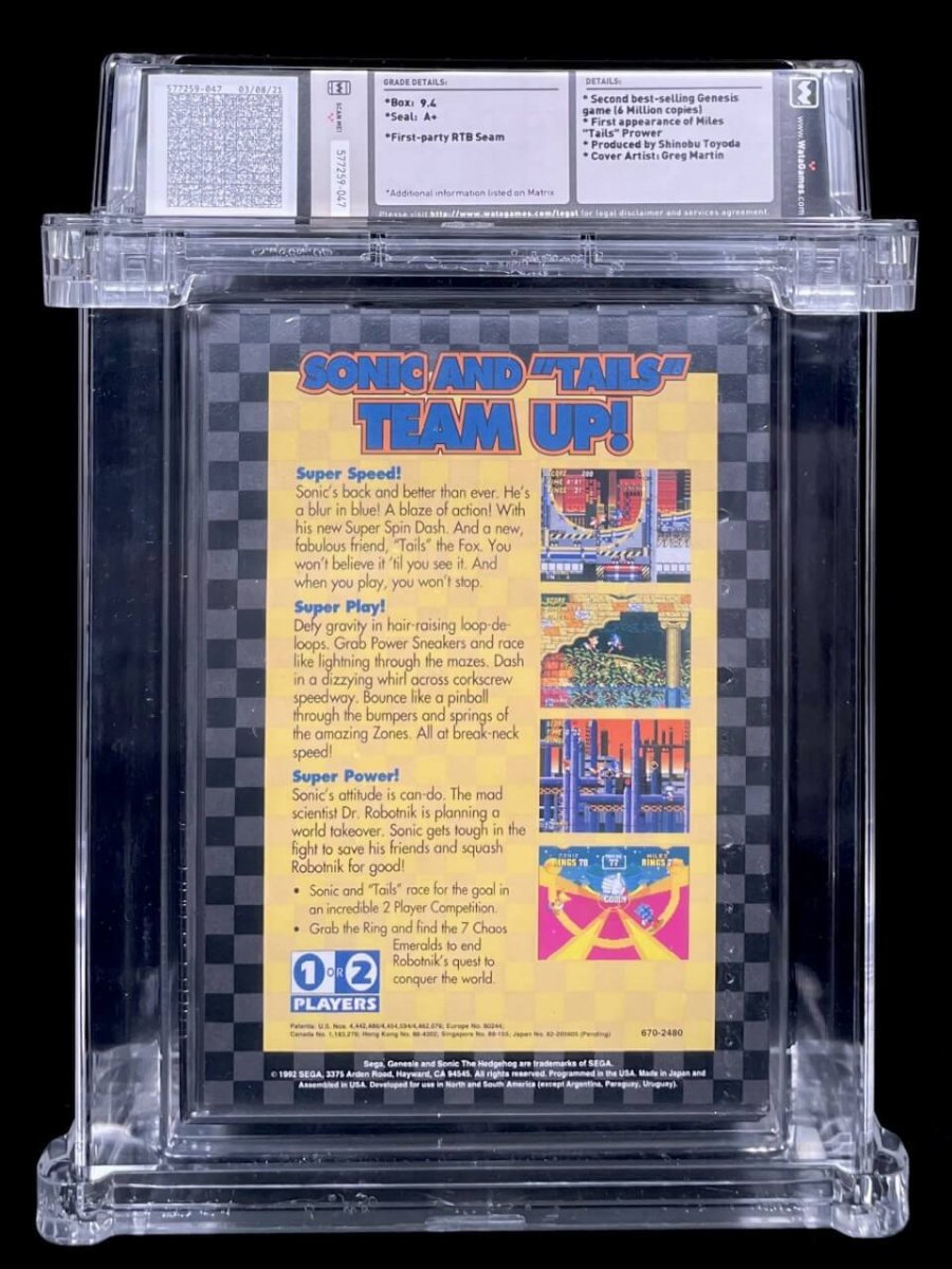 COMMENTS: A+ Seal Rating; First-Party RTB Seam; Clamshell; Made in Japan/Assembled in US; No Rating. 1st Appearance of sidekick "Tails"; Artist: Greg Martin; Produced by Shinobu Toyoda; Second best selling Genesis game.