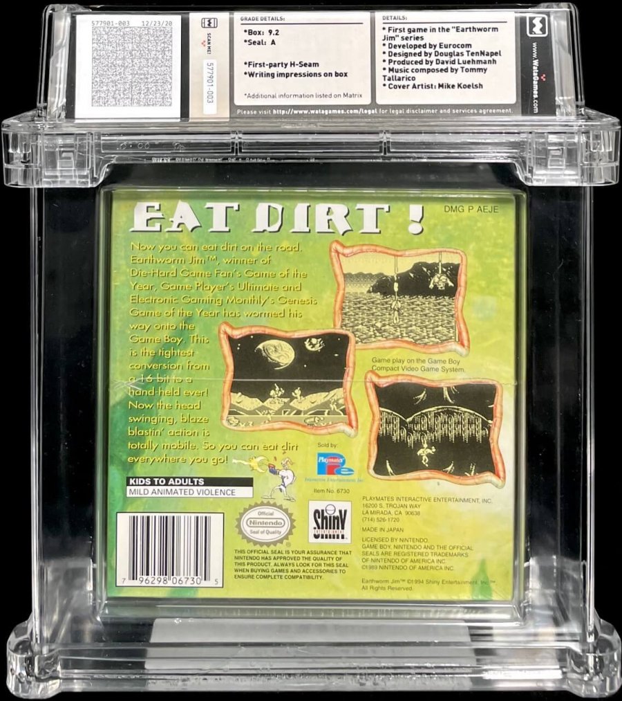 First game in the "Earthworm Jim" series; Developed by Eurocom; Designed by Douglas TenNapel; Produced by David Luehmanh; Music composed by Tommy Tallarico; Cover Artist: Mike KoelshEAT DIRT! Now you can eat dirt on the road. Earthworm Jim, winner of Die-Hard Game Fan's Game of the Year, Game Player's Ultimate and Electronic Gaming Monthly's Genesis Game of the year has wormed his way onto the Game Boy. This is the tightest conversion from a 16-bit to a hang-held ever! Now the head swinging, blaze blastin' action is totally mobile. So you can eat dirt everywhere you go!