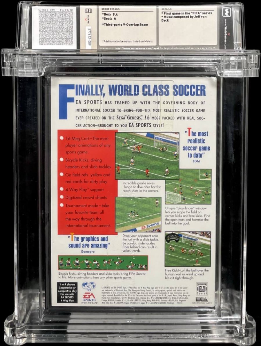 First game in the "FIFA" series; Music composed by Jeff Van DyckFinally, World Class Soccer! EA Sports has teamed up with teh governing body of international soccer to bring you the most realistic soccer game ever created on the Sega Genesis. 16 megs packed with real soccer action - brought to you EA Sports style!