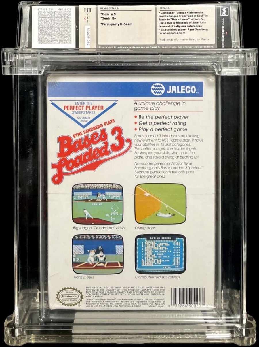 Jaleco hired Ryne Sandberg for an endorsment; Composer Tatsuya Nisimura's credit changed from "God of Soul" in Japan to "Music Lover" in the US, likely due to Nintendo of America's removal of religious references.Bases Loaded 3 introduces an exciting new element to NES game play. It rates your abilities in 13 skill categories. The better you get, the harder it gets. So sharpen your skills, step up to the plate, and take a swing at beating us! No wonder perennial All-Star Ryne Sandberg calls Bases Loaded 3 "perfect." Because perfection is the only goal for the great ones.