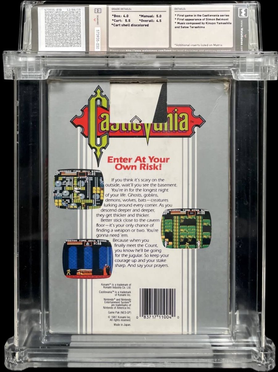 First game in the Castlevania series; First appearance of Simon Belmont; Music composed by Kinuyo Yamashita.The high-end video game market is booming. Recently, a graded Super Mario 64 broke world records by selling for $1.25 million dollars! Along with Mario and Zelda, Castlevania is one of the most-sought after classic video-game franchises. When it comes to rare NES games, this sealed Castlevania is one of the absolute best finds. A 1st edition of the classic console game Castlevania, the opening entry in Konami’s groundbreaking action-horror franchise, this copy earned a 9.2 A+ Seal Rating from video-game grading company Wata.