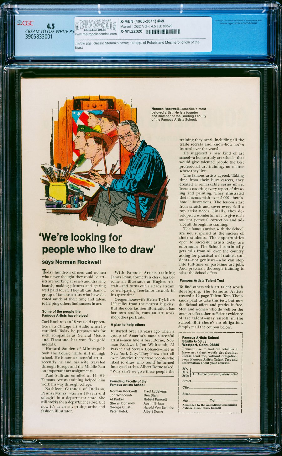 Adorned with a classic Jim Steranko cover, issue #49 of the X-Men deals with the subject of the growing population of mutants around the world and their struggle to exist in a society controlled by humans. After the FBI shuts down the X-Men, Angel returns to the X-Mansion to take one last look around — just in time for Cerebro to warn him of a spike in mutant activity. The X-Men reunite to investigate, and discover a plot by Magneto's evil agent Mesmero to turn mutants against humans and take over the world. Along the way, the young heroes run into a hypnotized woman named Lorna Dane. It turns out this mystery woman is not only a mutant, but also an object of worship to evil mutants in her presence. The backing story "A Beast is Born" sheds some light on Hank McCoy's humble beginnings.