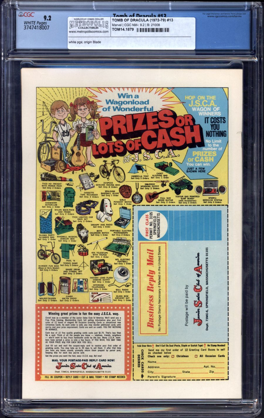 origin and 3rd app. of Blade; 1st cameo appearance of Deacon Frost, the vampire who bit Blade's mother; COMIC BOOK IMPACT rating of 6 (CBI)"To Kill a Vampire!" Written by Marv Wolfman. Art by Gene Colan and Tom Palmer. The slayers have finally tracked Dracula back to his layer, but can even this fierce team of vampire hunters destroy the most powerful vampire to ever stalk the earth? Plus, the origin of Blade!