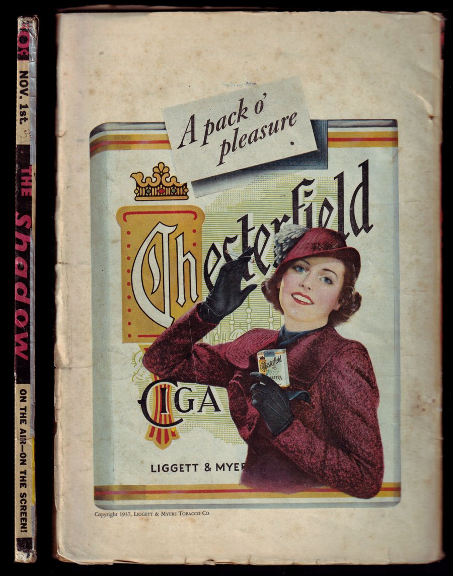 November 1, 1937. Only photo cover of actor Rod LaRocque as the Shadow. The Shadow stars in "Death Turrets" by Maxwell Grant. Other detective and mystery stories by Steve Fisher, Norman A. Daniels, and George Allan Moffatt. 7" x 10"; black and white.