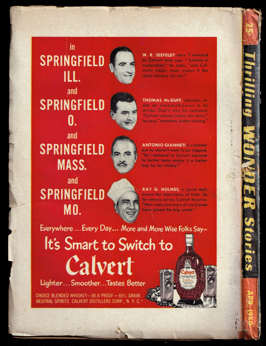 April 1950. Stories by Murray Leinster, James Blish, John D. MacDonald, Ray Bradbury, Wallace West, Cleve Cartmill, Walt Sheldon, and Carter Sprague. One Virgil Finlay illustration.