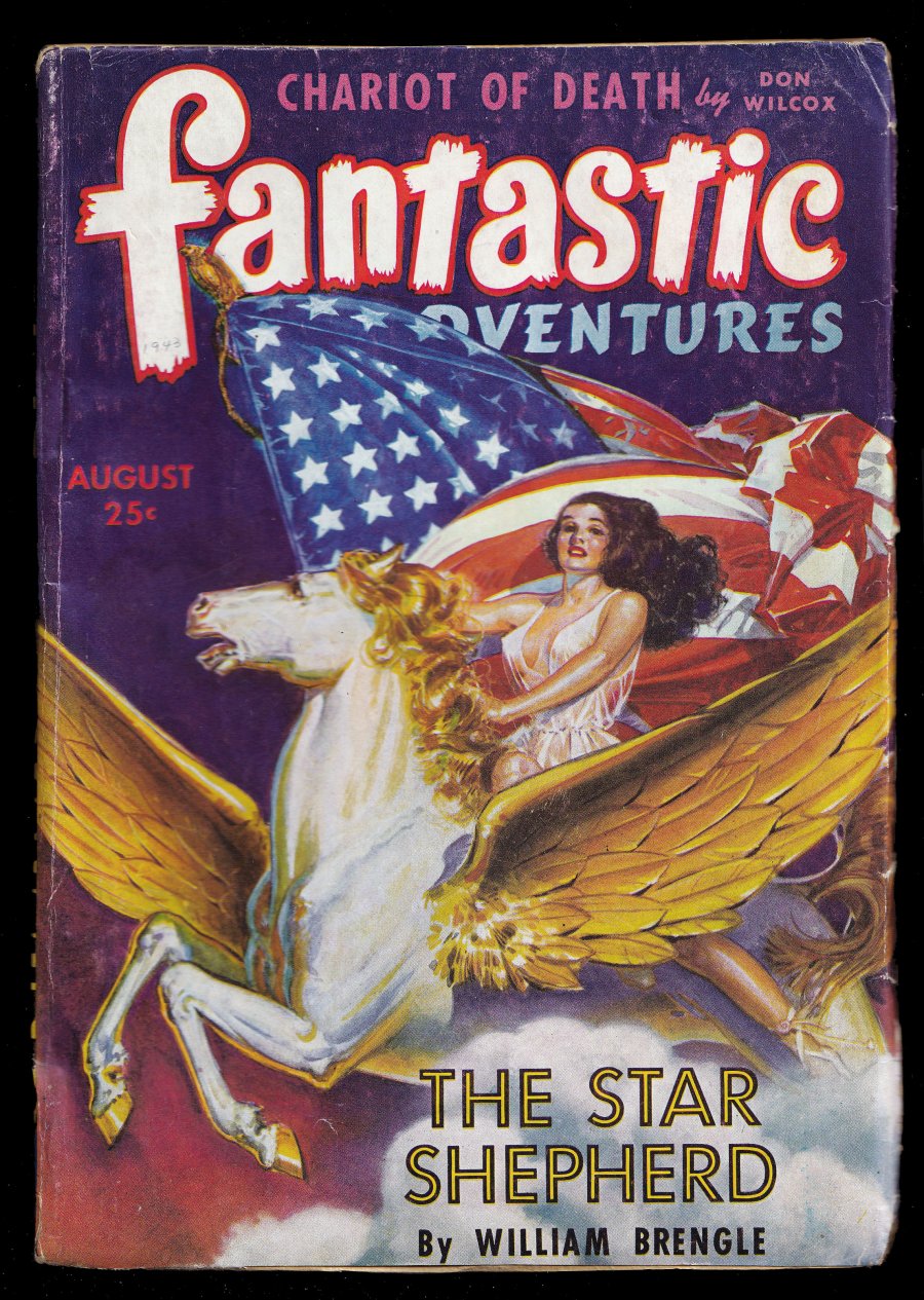 August 1943. classic American flag classic cover by Robert Gibson Jones. Science Fiction and Adventures stories. This issue features "Chariots of Death" by Don Wilcox, and "The Star Shepherd" by William Brengle. Softcover Pulp, 7-in x 10-in, 212 Pages, B&