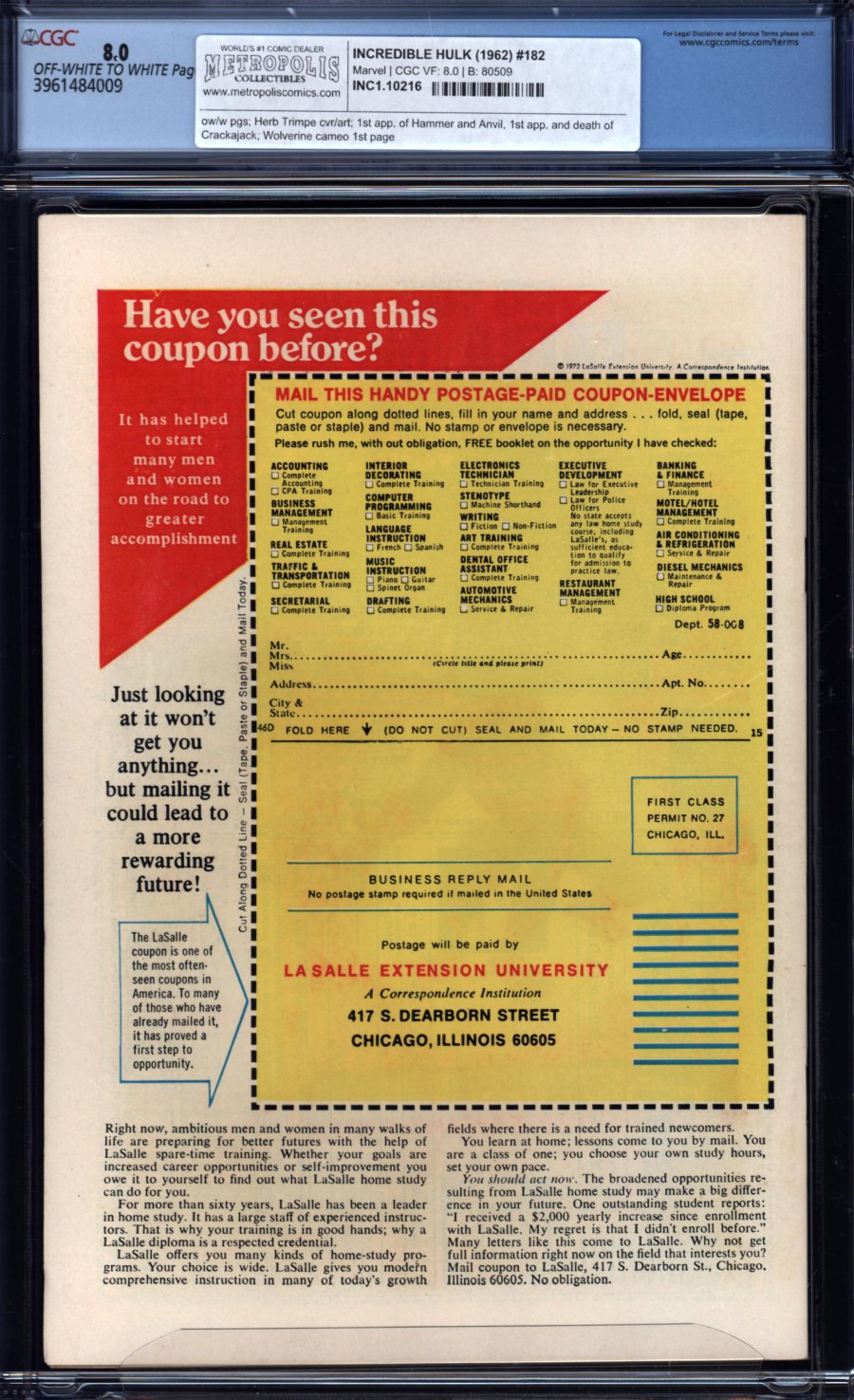 1st app. of Hammer & Anvil, 1st app. & death of Crackajack; Wolverine cameo 1st page; Herb Trimpe art; COMIC BOOK IMPACT rating of 7 (CBI)