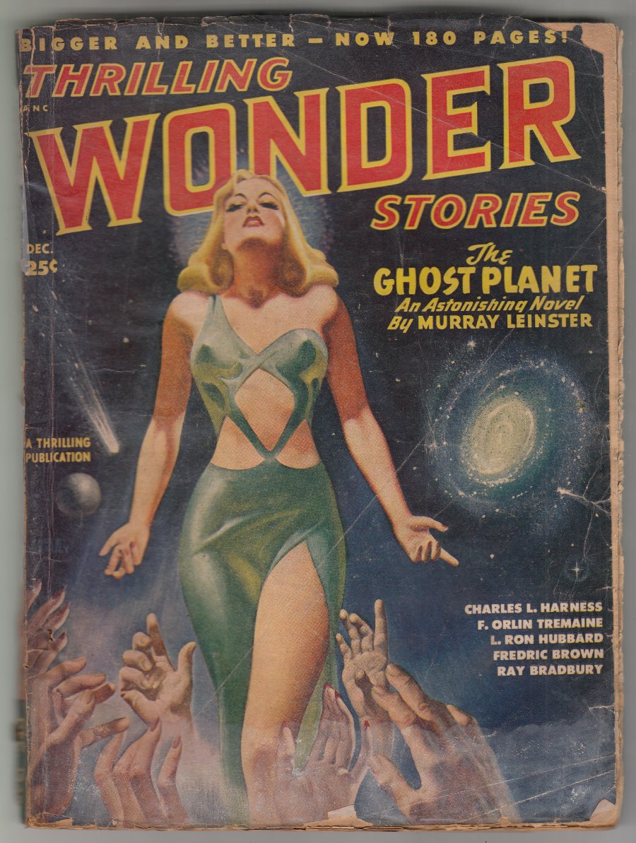 December 1948; good girl cover by Earle K. Bergey; Martian Chronicles story by Ray Bradbury, stories by Murray Leinster, L. Ron Hubbard, Noel Loomis, John D. MacDonald, and Frank Belknap Long; Five Virgil Finlay illustrations"The Ghost Planet" story by Murray Leinster; "240,000 Miles Straight Up" story by Scientology founder L. Ron Hubbard; "Schizophrenic" story by Noel Loomis; "Fruits of the Agathon" story by Charles L. Harness; "World on a Pogo Stick" story by F. Orlin Tremaine; "A Horse on Me" story by Benj. Miller; "The Off Season" story by Ray Bradbury (republished in The Martian Chronicles); "The Mobius Trail" story by George O. Smith; "A Child Is Crying" story by noir author John D. MacDonald; "Knock" story by Frederic Brown; "High School Alchemist" story by Carter Sprague; "Fuzzy Head" story by Frank Bellknap Long
