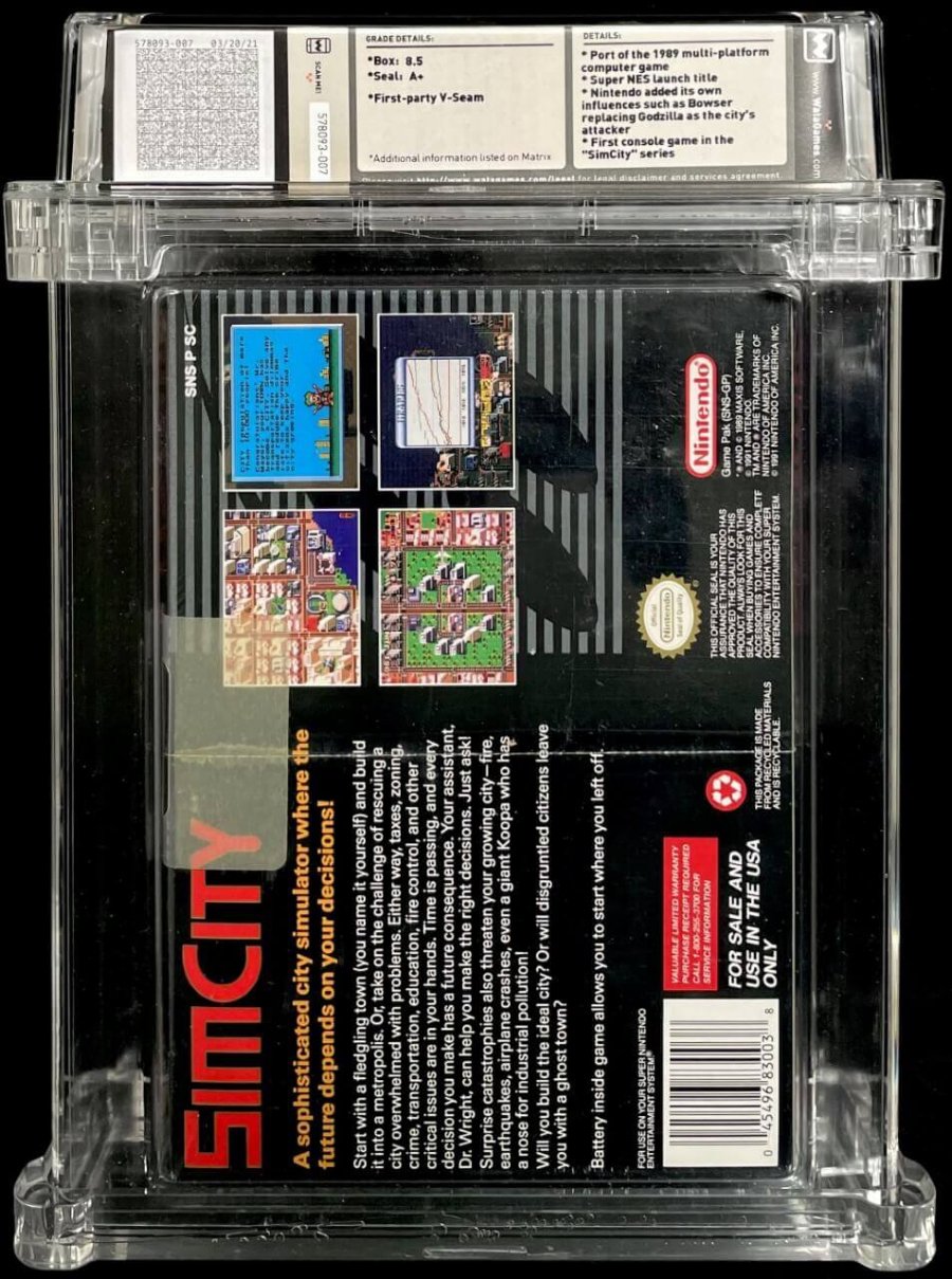 A+ Seal Rating ;First-Party V-Seam; Made in Japan; No Rating; 4 Line Warranty Box; w/Game Pak (SNS-GP) (USA Code)Port of the 1989 multi-platform computer game; Super NES launch title; Nintendo added its own influences such as Bowser replacing Godzilla as the city's attacker; First console game in the "SimCity" series.